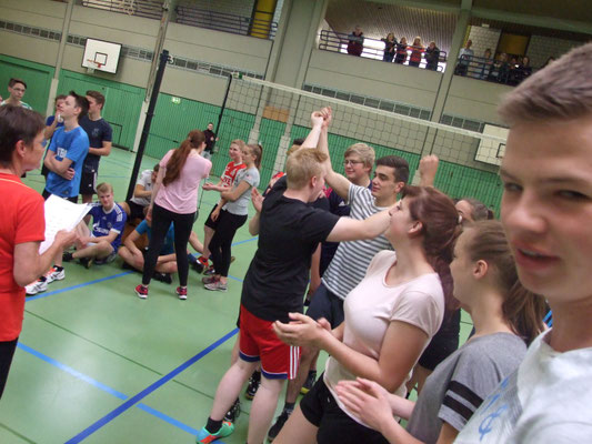In der Woche vor der Entlassfeier wurde wie in jedem Jahr ein Volleyballturnier für die Abschlussklassen organisiert. Jede Klasse stellte zwei Mannschaften, dann wurde „Jeder gegen Jeden“ gespielt. Nach tollen Spielen konnte sich am Ende die Mannschaft 1 der Klasse 10d als Turniersieger durchsetzen. Herzlichen Glückwunsch!